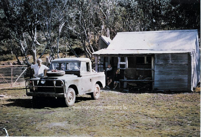 The original Bluff Hut (5,200 ft) built by mountain cattlemen – Eadley Stoney and Riley children – hut built in 1956 by Eadley Stoney, Archie Cameron, Ray Kelly and Jack Ware who shaped timbers by hand using a broad axe, adze and crosscut saw. Snow gum and mountain ash timber was sourced from bush adjacent to Bluff Saddle. Graeme Stoney, aged 15 years, packed all corrugated iron from Bindaree (end of jeep track) onto pack horses. All materials were carried in by pack horse before 4 WD trucks. The hut was completed in the summer of 1956. This was an unusually wet summer season. It was also the year that Darlingford, the back water of Eildon was flooded.