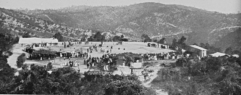 The sports ground on the hilltop above the Junction, with close up of the bush-house shelters. Cricket Ground at Walhalla.