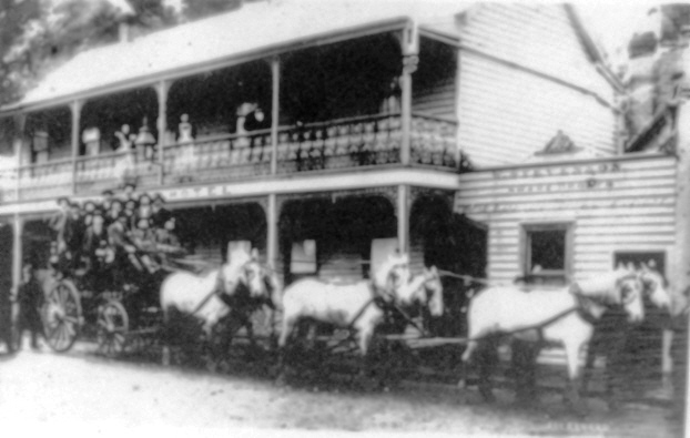 The Walhalla football team in front of Conlan’s ‘Star’ Hotel, Walhalla, on their horse-drawn buggy. Beside the Hotel can be seen the office of W. Stevenson, Share Broker.