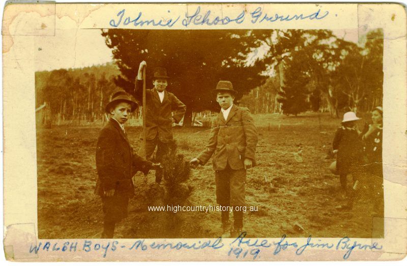 Tolmie School Ground – Memorial Avenue for Jim Byrne – Walsh brothers (John, Mike and Larry) planting a memorial tree for Jim Byrne 1919. For message on reverse of postcard – see VMHSP3726