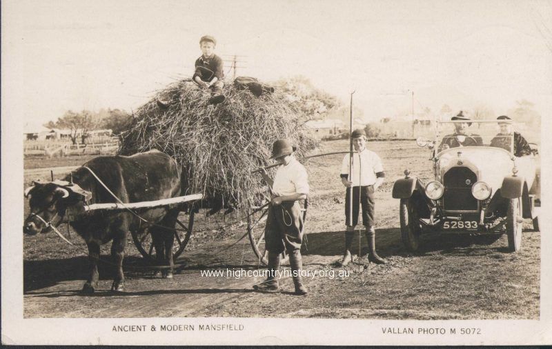 Vallan postcard showing early farming transport in Mansfield – a hay cart and a motor vehicle. Boys and men unknown.