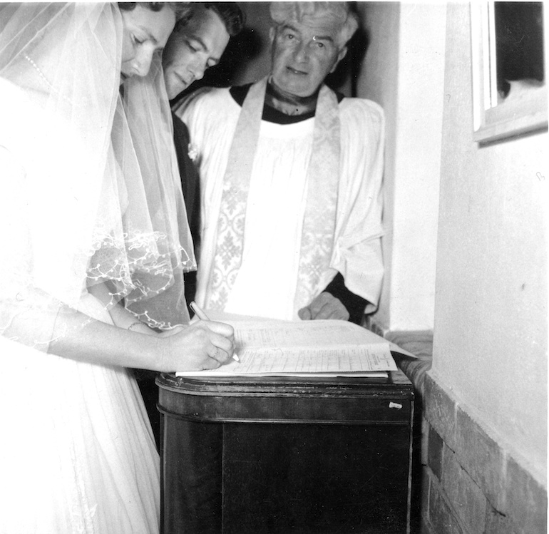 Nina June Leighton and Albert Frederick Walsh signing their wedding certificate in front of their Marriage Minister,Canon R.V. Brown, St Johns Church of England, Mansfield. 5/11/1960. Guy Fawkes Day. Canon R.V.Brown died 5/11/1964 exactly 4 yrs after Albert & Nina’s Wedding.