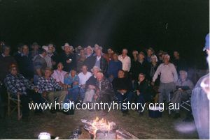 DROVING IN GIPPSLAND ALBUM. COLOUR PHOTO OF LARGE GROUP OF PEOPLE AROUND CAMPFIRE