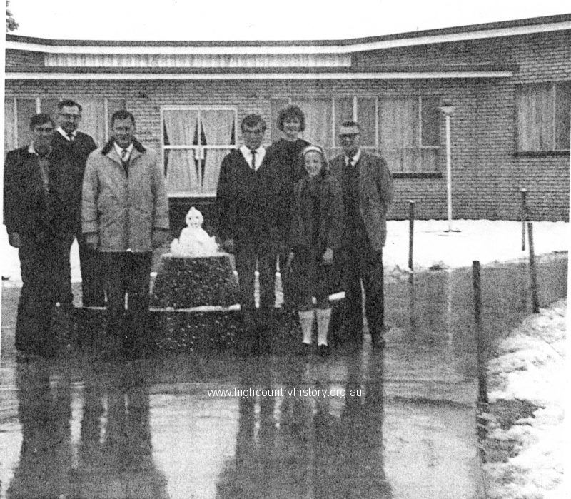 Graeme Williamson (Assistant Engineer), Zoltan Adams, Ray Bodley, John Olver, Unknown, Helen Mullins and Russ Womersley in front of the Shire Municipal office, Mansfield, in the snow, May 1969.