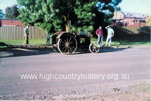 Bernie Anstee driving Hart Parr tractor – MMC Festival 1994 – pulling timber jinker loaded with “canoe tree” log.