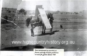 Iron transported up Mt Buller on frames specially built for packhorses to build Mt Buller Chalet, 1929.