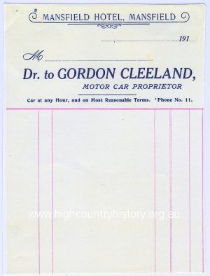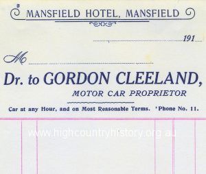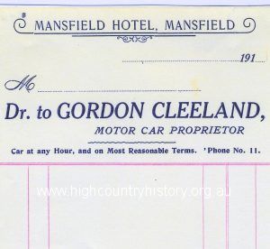 Business card- Gordon Cleeland – Motor Car Proprietor – Mansfield Hotel – taxi