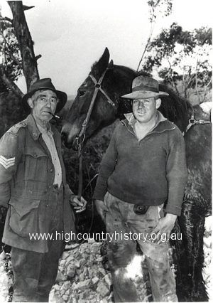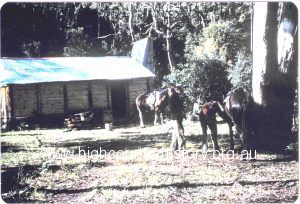 6 mile hut – Howqua area – Harold Doughty standing watching Trevor Burgess saddle a horse.