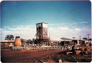 Chip hopper sawdust burner – Fork loading logs onto infeed of the mill. To the right Mansfield Railway Station – Burwood Timber Mill.