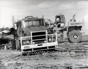 Marbut-Gunnersen Sawmill. W26 loader transporting logs from preparation area to mill.