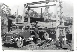 Jack Healy and Gordon Harrison. Wilson’s Log Truck (Ford) Benalla, VIC. Jack Healy’s house in the background. Toombullup