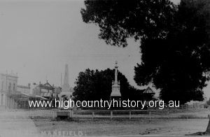 High Street, Mansfield with monument to Dr Reynolds, Trooper’s Monument and Band Rotunda