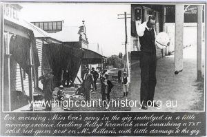 Highett Street, Mansfield. Accident – Miss Cox’s pony and gig collided with Kelly Hotel’s Verandah post.