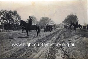 Coming into Mansfield – The local district’s horsemen and women form a guard of honour for the arrival of Archbishop Mannix.