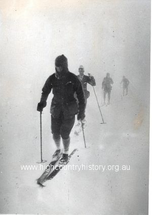 Four Melbourne University members skiing at Mt Buller