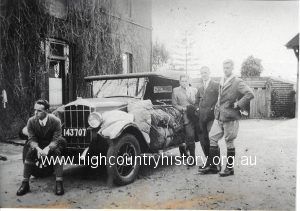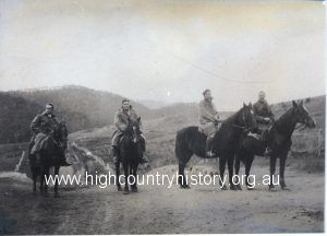 Four Melbourne University members on horses on Mt Buller