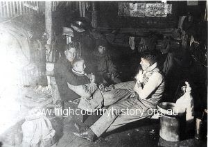 Four Melbourne University members inside Mansfield Progress Association hut.